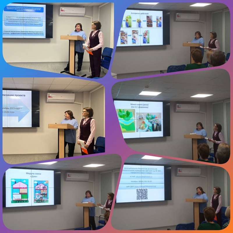 В сессии «Инновационные инклюзивные практики в сфере образования» выступили наши представители педагогической команды: старший воспитатель Баринова Наталья Сергеевна и учитель-дефектолог Егорова Наталья Альбертовна по теме «Современная интерактивная модультека как инструмент развития познавательных инициатив старших дошкольников с ограниченными возможностями здоровья». В рамках выступления были обозначены вопросы организации интерактивной модультеки в условиях ДОУ и в семьях воспитанников, а также подведены промежуточные результаты функционирования РИП в МБДОУ «Детский сад № 384» г.о. Самара с сентября 2023 года.